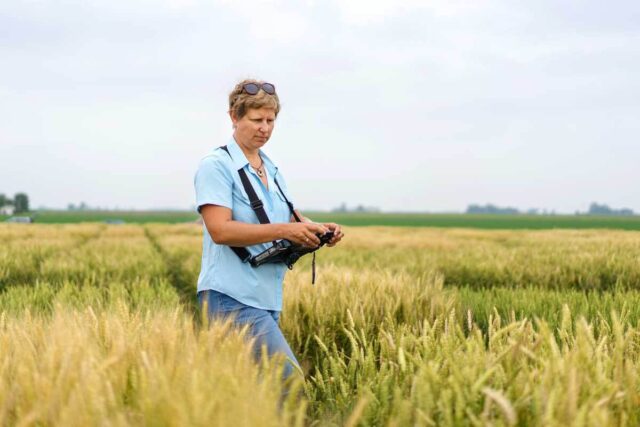 Jana Murche, Leiterin der nordamerikanischen Weizenzüchtung bei KWS, ist ebenfalls im Feld und sammelt händisch phänotypische Merkmale. Sie kann aber immer nur einen kleinen Teil einer Parzelle sichten. „Besser wäre es, die Pflanzen fortlaufend im Auge zu haben und zu sehen, wie sie sich im Feld bewähren“, sagt Jia Yan, Projektleiterin für digitale Innovationen bei KWS in den USA.