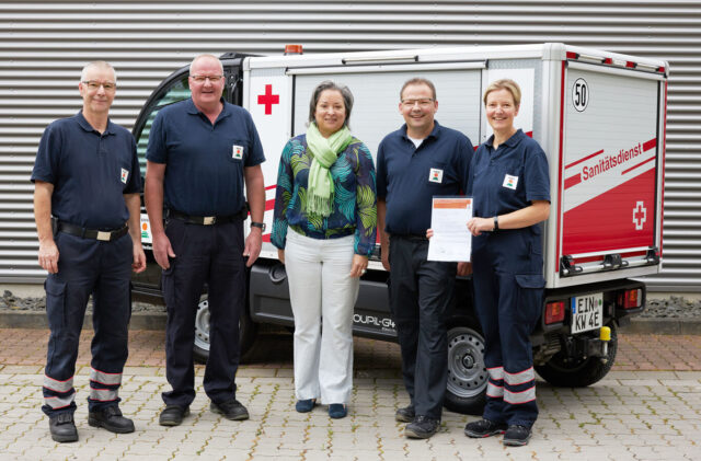 Betriebssanitäter-Gruppenführer Frank Labes (links) und Vorstandsmitglied Eva Kienle (Mitte) überreichen im Beisein von Tobias Brackmann, Leiter Werkfeuerwehr (Zweiter von rechts), sowie seinem Stellvertreter Matthias Weger Kathrin Weber die Ernennungsurkunde zur Betriebssanitäterin.